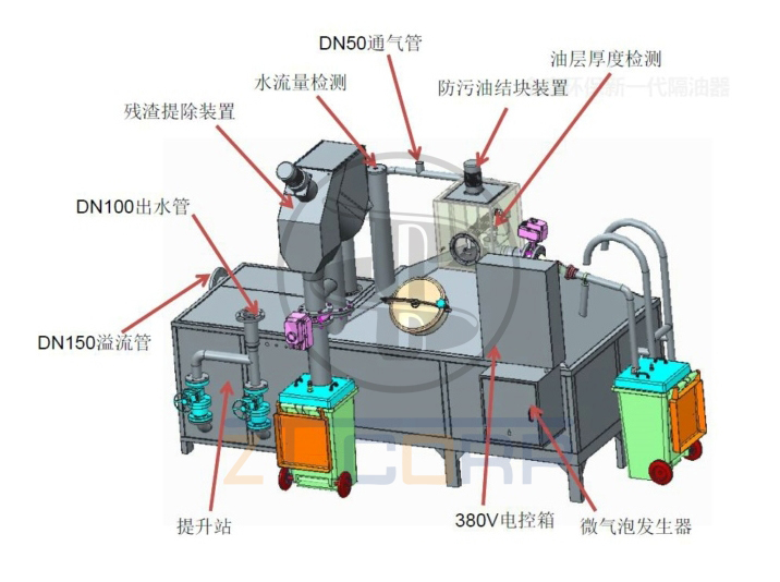 餐飲廢水以及其它含油污水在進入隔油池前首先通過殘渣提除裝置,可以有效過濾掉殘渣并自動提走,通過以上功能有效實現餐飲廢水以及其它油污液體的油、水、渣的三相分離。