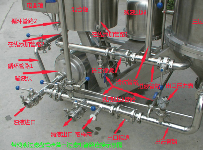 過(guò)濾時(shí),首先在過(guò)濾盤(pán)上形成硅藻土預(yù)涂層。被過(guò)濾的液體經(jīng)硅藻土預(yù)涂層時(shí),其中的雜質(zhì)即被阻擋;而純靜的液體經(jīng)過(guò)微觀管狀或片狀的間隙以及顆粒之間的間隙通過(guò)過(guò)濾層,從而起到過(guò)濾作用。隨過(guò)濾時(shí)間的推移,在預(yù)涂層上被濾掉的雜質(zhì)會(huì)越來(lái)越多,且將阻塞過(guò)濾通道。因此在過(guò)濾過(guò)程中,還需對(duì)進(jìn)入過(guò)濾罐的被過(guò)濾的液體,添加一定劑量相應(yīng)粒度的硅藻土,以維持正常的過(guò)濾過(guò)程。另外,如果過(guò)濾時(shí)需要脫色,還需加入一定比例的活性炭。