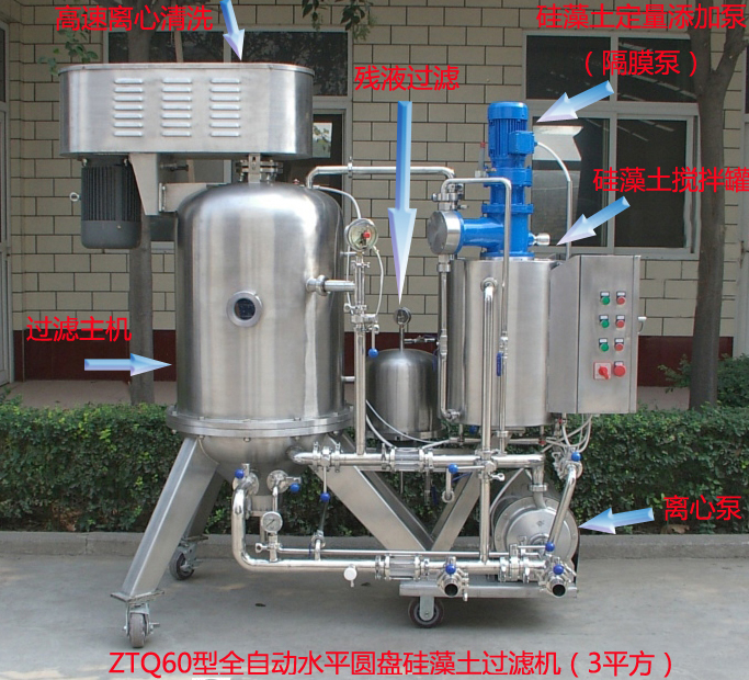 ZTQ60型上傳動(dòng)水平圓盤(pán)式硅藻土過(guò)濾機(jī)屬于硅藻土過(guò)濾機(jī)系列中的水平盤(pán)式不銹鋼編織網(wǎng)過(guò)濾機(jī),是我公司在引進(jìn)瑞士FILTROX公司制造技術(shù)的基礎(chǔ)上,通過(guò)消化和吸收新的過(guò)濾技術(shù)和制造工藝,并根據(jù)國(guó)內(nèi)現(xiàn)狀研制的新型澄清性過(guò)濾設(shè)備。過(guò)濾介質(zhì)可選硅藻土、珍珠巖粉和活性炭,通過(guò)該機(jī)的分離能使直徑為1~3um的菌體及固體微粒100%截留,而更好地保留原液的特性,其濁度值可達(dá)0.5EBC以下,而且外觀更符合要求。該過(guò)濾機(jī)廣泛應(yīng)用于果酒、保健酒、葡萄酒、黃酒、口服液、生物發(fā)酵液、飲料、糖漿、醬油醋、食品添加以及醫(yī)藥和化工等行業(yè)液態(tài)制品的澄清性過(guò)濾。