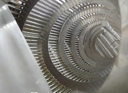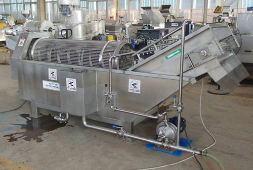 該清洗機采用逆流洗滌原理壓噴淋管,使物料在整個翻轉移動的過程中又受到高壓水的噴淋沖洗,清洗效果好,可有效除泥、除沙。清洗后的物料由清洗槽內的提升機提升到下道工序。,物料從進口流入清洗機滾筒內,隨著滾筒內壁的螺旋轉動至出口,而清洗槽內的水,在滾筒內螺旋的反作用下流向清洗機進口,與物料逆向運動,同時在滾筒內安裝有高