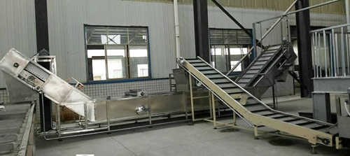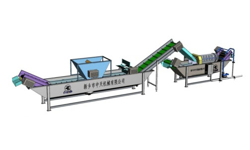 漂浮在水面的輕物質由翻板推送到出料輸送帶,往水下沉的重物質有水槽底部的輸送帶從另一端輸送提升到滾筒清洗機,重物質中的小顆粒雜質會從滾筒清洗機的滾筒網中漏下,往水下沉,沉到清洗機底部的輸送帶上,由輸送帶從另一端送出去。清洗后的物料由清洗機自帶的提升機提升到擠壓分離機中進行榨汁。