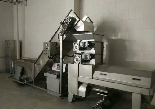 將經過挑選、清洗的新鮮石榴切口、擠開、分離出石榴皮,并將果漿輸送至壓榨機進行下道工序的生產。